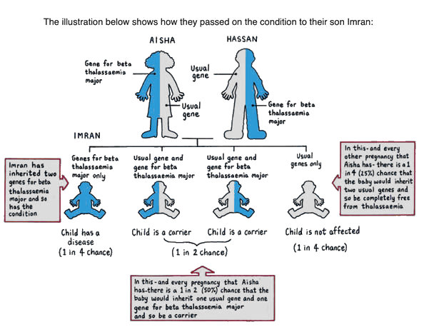 These chances are the same each time Aisha and Hassan have a baby. Their next child could have beta thalassaemia major like their child Imran, be a carrier or be completely free from thalassaemia.